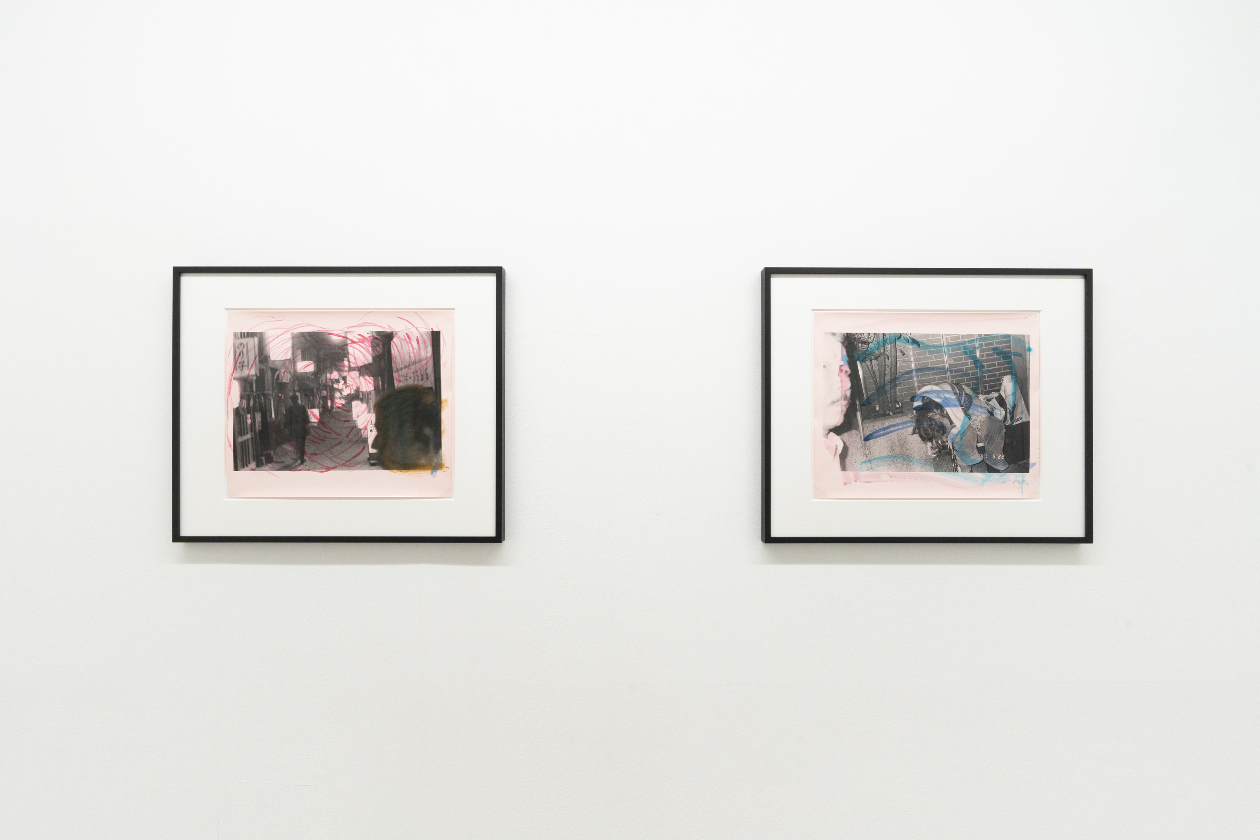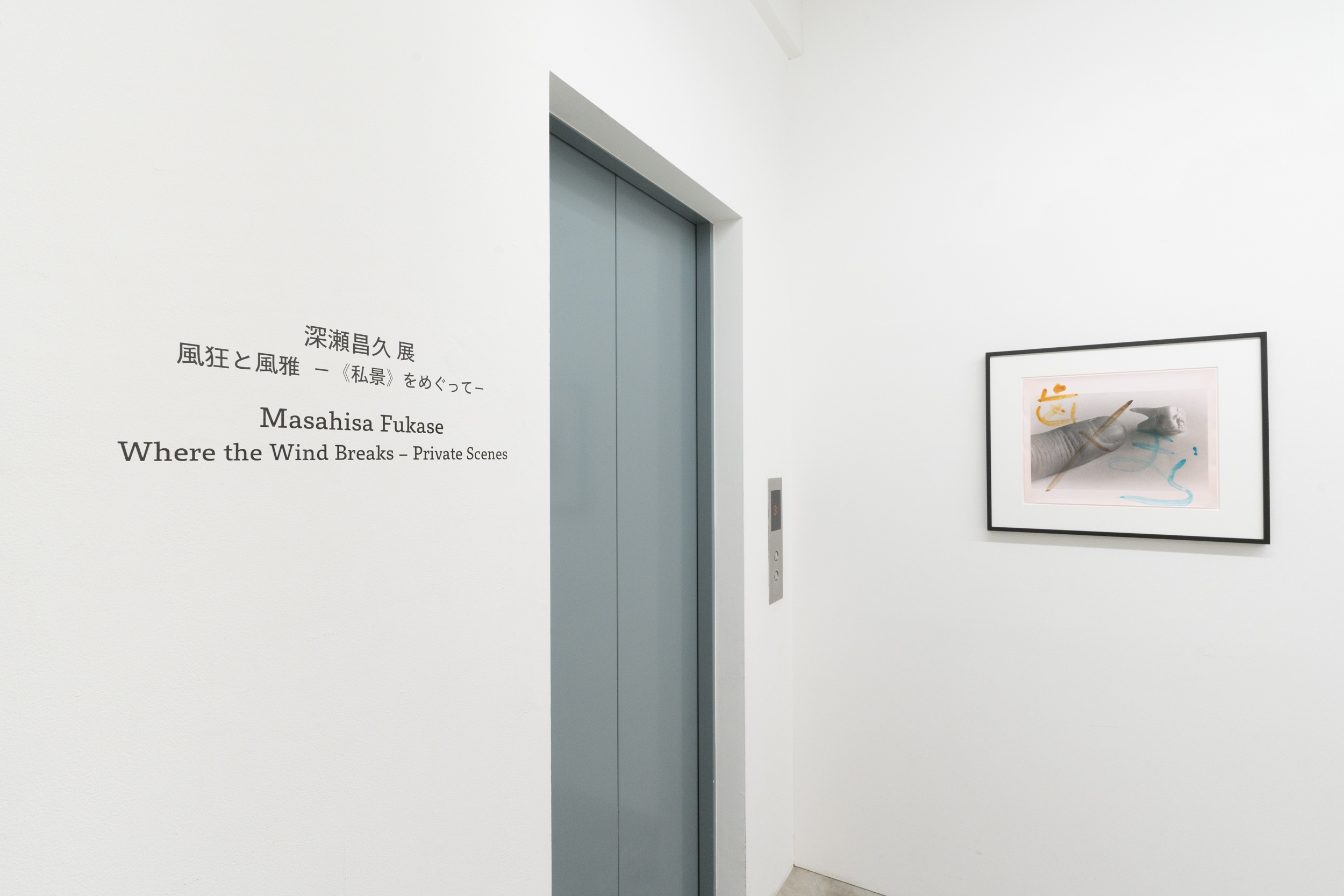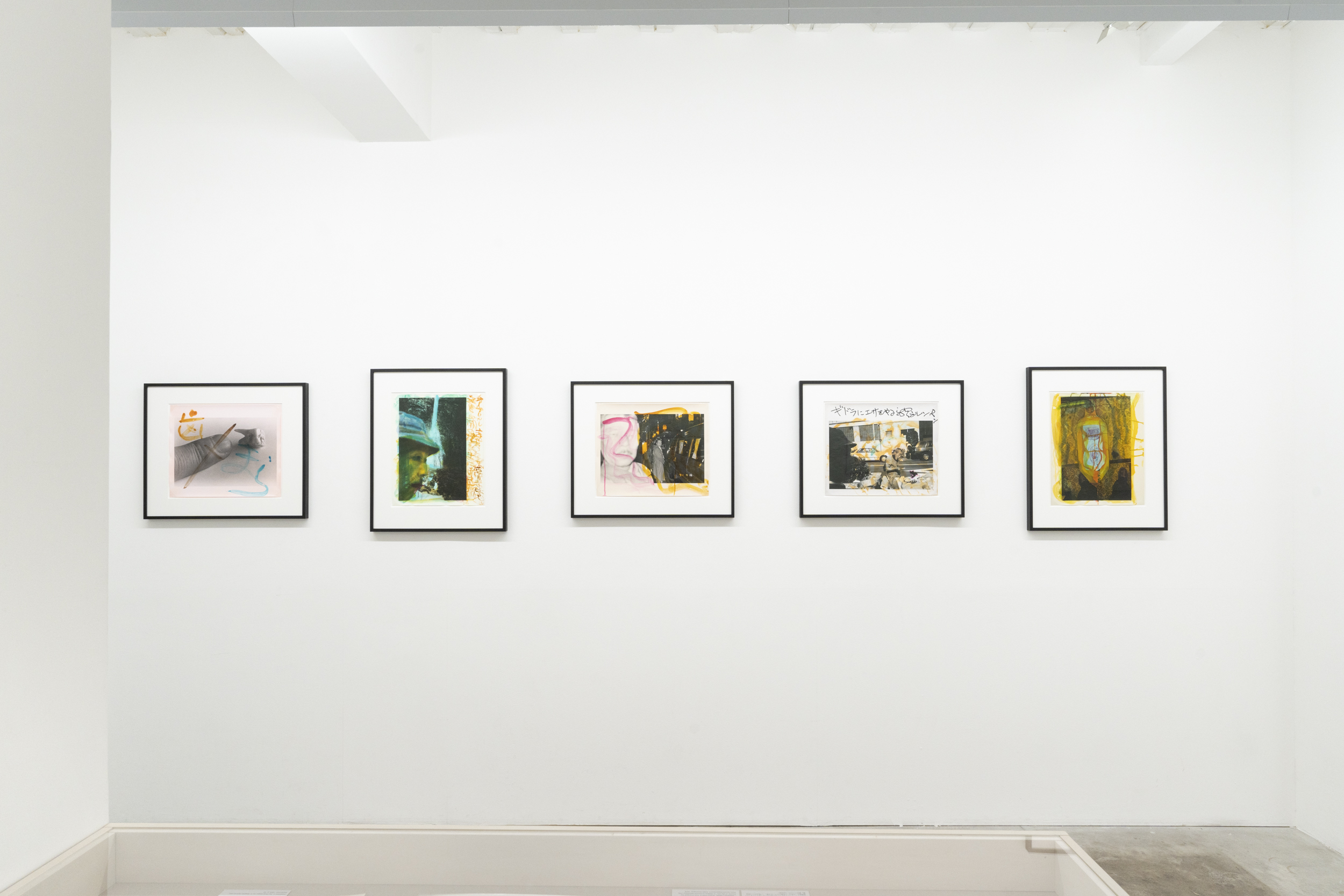 《私景’92》ではコニカビッグミニを使い、ノーファインダーで自分の顔や手、足をフレームにいれて撮影しました。その後、銀塩プリントの上から水彩絵の具で着彩、とくには言葉を添えたりして完成させています。プリントの上を縦横無尽に走り回る様々な色のストロークは、現実の風景に自身の内部から放射する衝動を重ね、描いているようにも見えます。街の路上や風景を撮影したという意味では80年代に発表された《歩く眼》に近いのですが、そこに自分の顔など身体が写しこまれているため、「見る-見られる」「撮影者-被写体」の関係が錯綜しています。さらに、着彩するときの身振りが加わることで、幾重にも重なった深瀬の眼差しと身体が見るものを揺さぶる作品群です。本展では特にこれらの着彩された写真群で展覧会を構成致します。